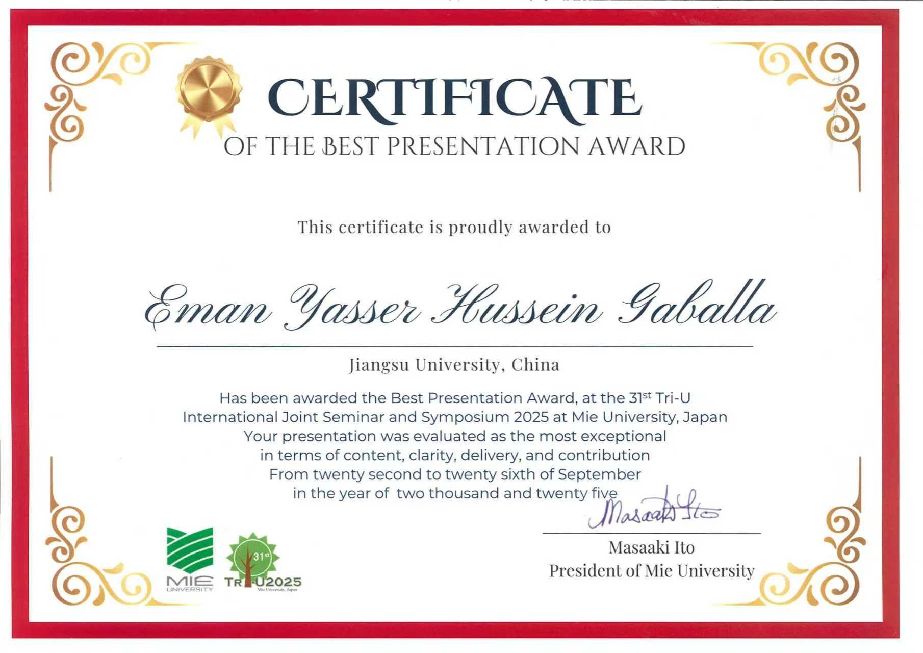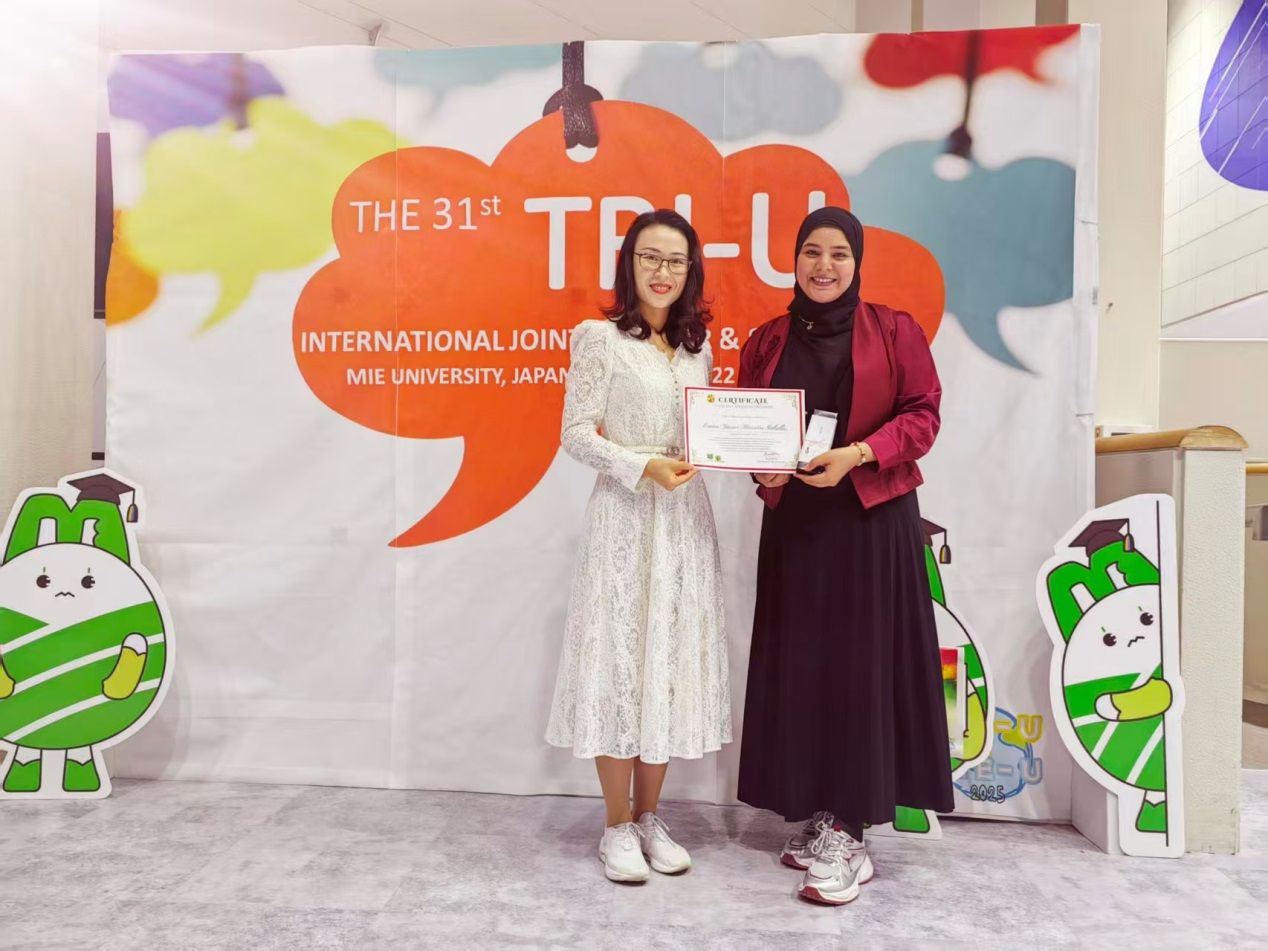 杏吧论坛 留学生EmanYasser通过单位推荐、资格审查、论文评审、综合面试等层层选拔,作为2名来华留学学历研究生代表之一赴日本参会,并经激烈角逐,获得本次学术研讨会最高荣誉“大会最佳汇报奖”。