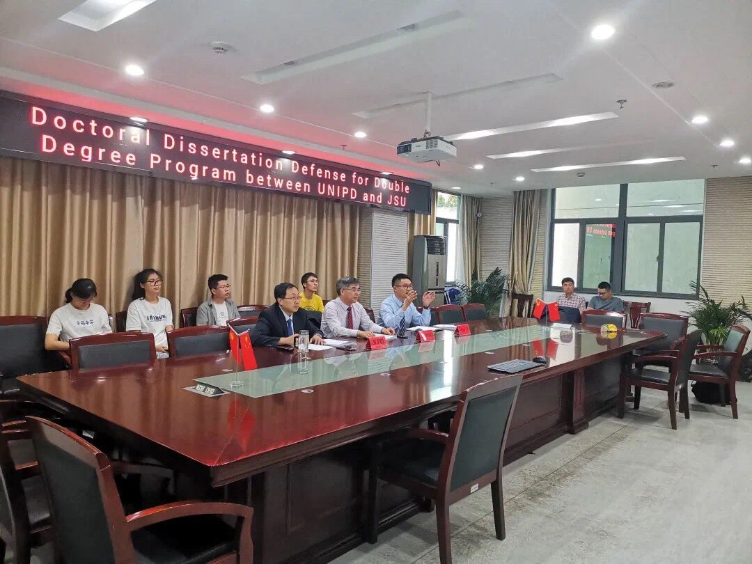 On May 30, the double doctorate dissertation defense meeting of postgraduate Yin Tingyun was held by the combination of online and offline. According to the cooperation agreement signed by the two universities, the defense committee is composed of experts from both China and Italy. Prof. Luo Xianwu of Tsinghua University served as the chairman of the Defense Committee. The other members of the Defense Committee are Prof. Ernesto Benini and Prof. Giovanna Cavazzini of Università di Padova, Prof. Pei Ji of Jiangsu University. As the supervisors of Yin Tingyun, Secretary of the Party Committee Prof. Yuan Shouqi and Prof. Giorgio Pavesi of UNIPD attended the meeting.